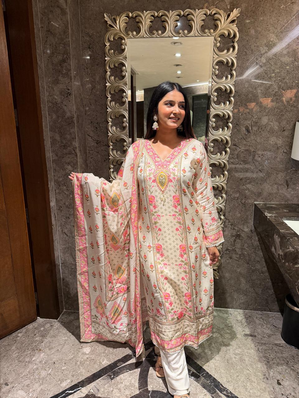 Elegant Beige Floral Printed Suit Set with Dupatta for Women | Festive Ethnic Wear