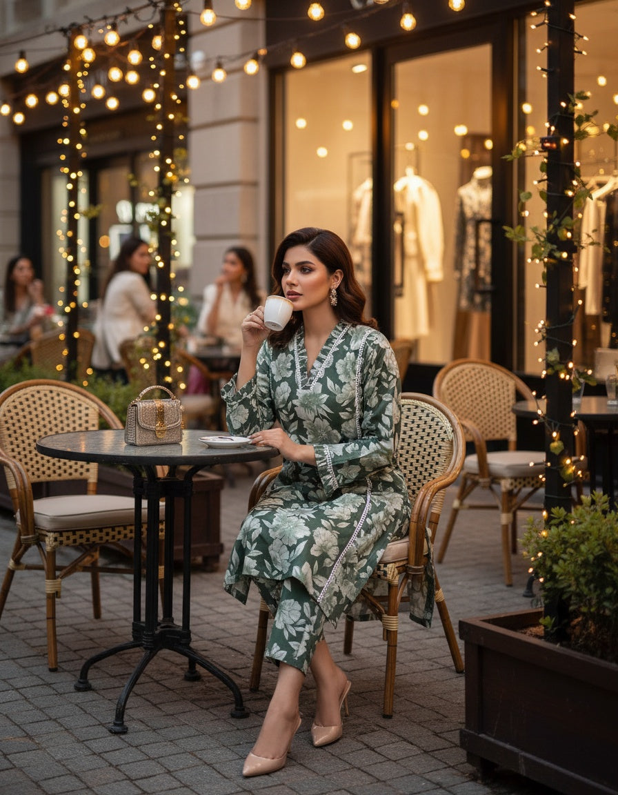 Refresh your ethnic collection with this elegant green floral cotton co-ord set. Designed with a straight-fit kurti and matching pants, this set features an all-over floral print for a timeless appeal. Lace piping along the neckline and sleeves adds a touch of sophistication. Made from soft and breathable cotton, it is perfect for daily wear, office, festive gatherings, or casual outings, ensuring both comfort and style throughout the day.